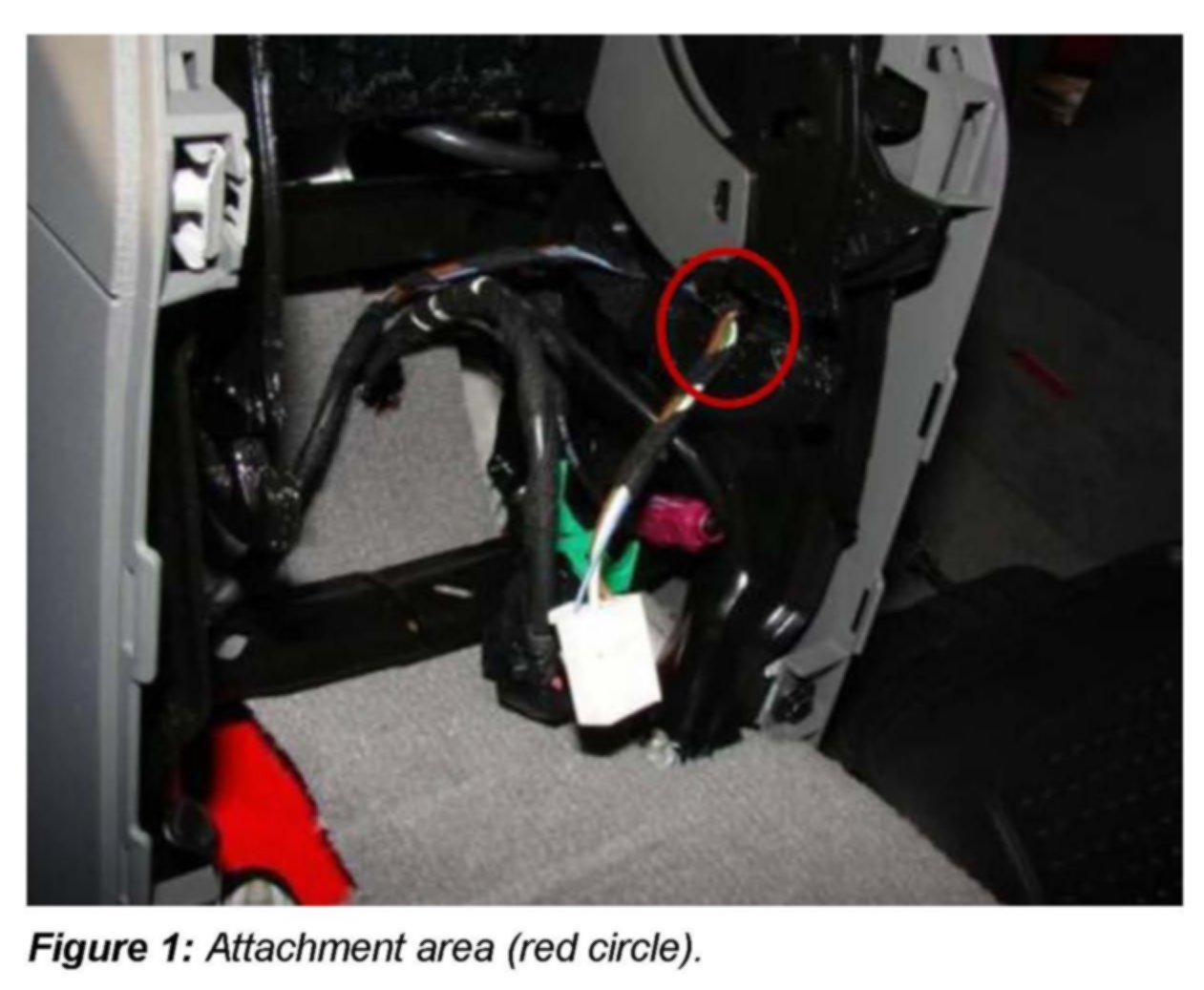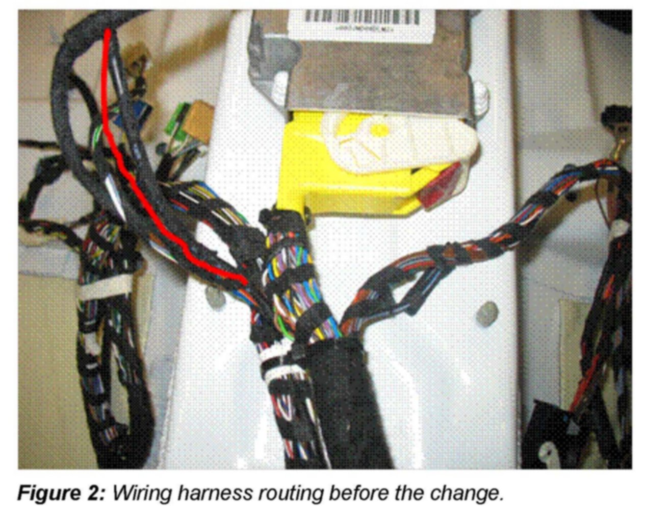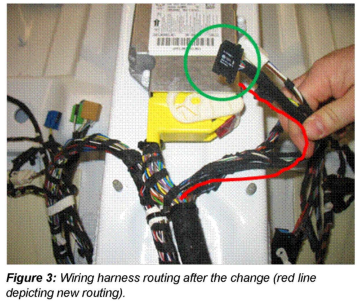 3. Move the wiring harness to the right under the airbag control unit wiring according to Figure 3. This shortens the wiring harness for the 12 volt socket and reduces possible contact with the center arm rest attachment.