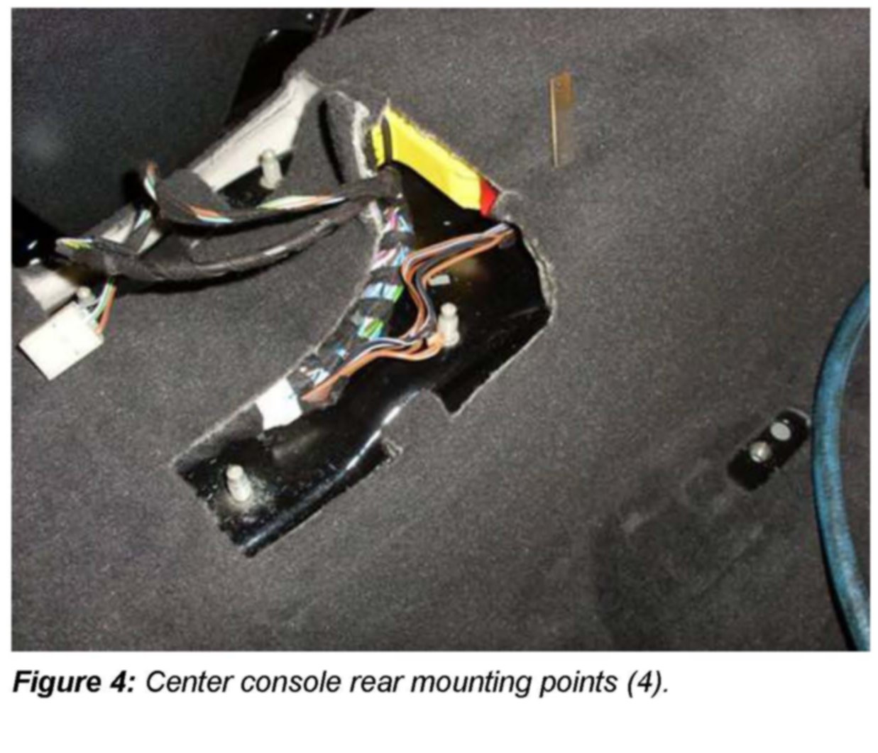 4. Another potential area where the wiring harness may become pinched or damaged is at the center console rear mounting points (Figure 4).