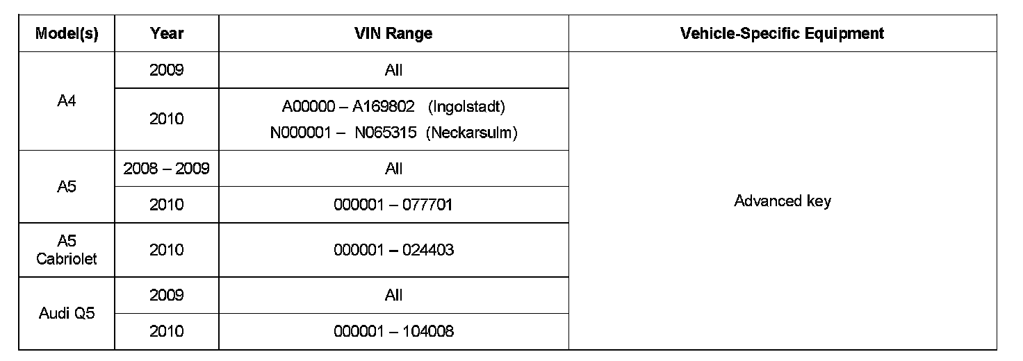 ^ Any or all of the following DTC 03285, 03286, 00192, or 00193 (Outside door handle touch sensor - short to ground or incorrect signal) may be stored in the Access and Start Authorization Control Module J393 (address word 05).