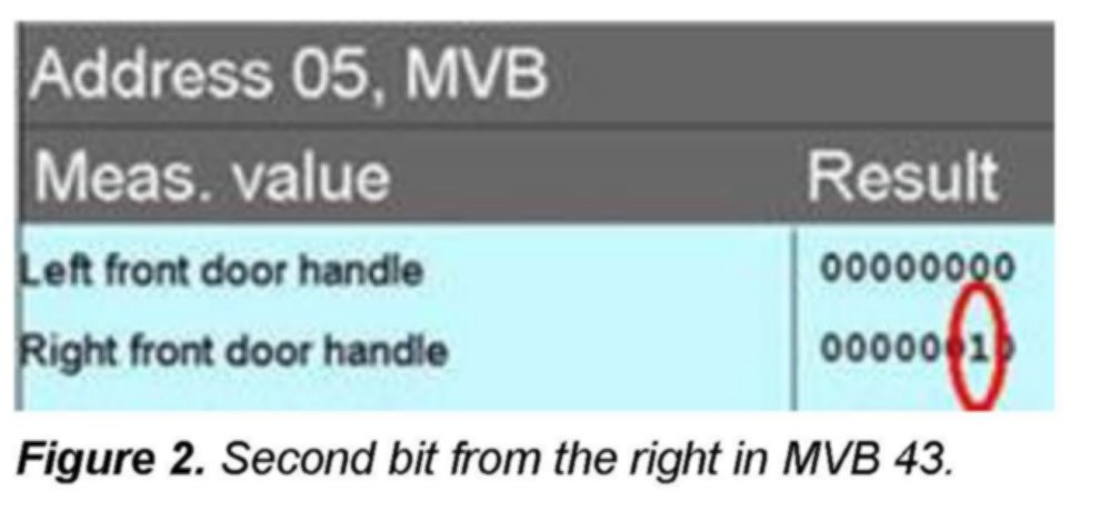 2. Check Measured Value Block 43 in Access and Start Authorization Control Module J393. If the second bit from the right (Hall sensor) of the affected door handle is always 1 the handle must be checked for an installed magnet.