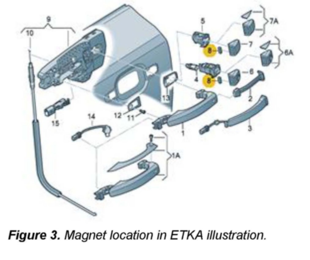 3. Pull the affected door handle open and check if the magnet is installed (indicated as position 8 in ETKA illustrations and seen in Figures 3-5).