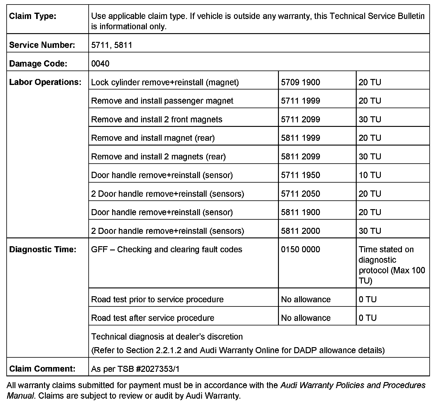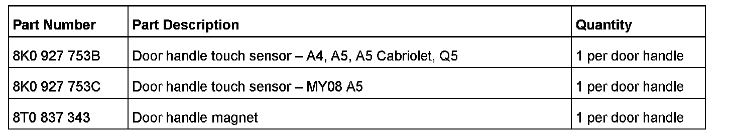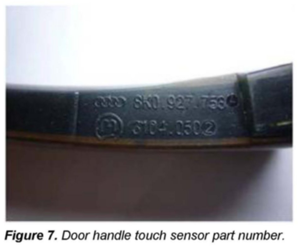 7. Replace all door handle sensors with part number 8K0 927 753 or 8K0 927 753A. Part numbers 8K0 927 753B and 8K0 927 753C are optimized - do not replace them.
