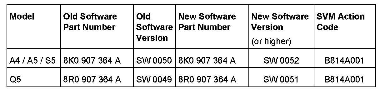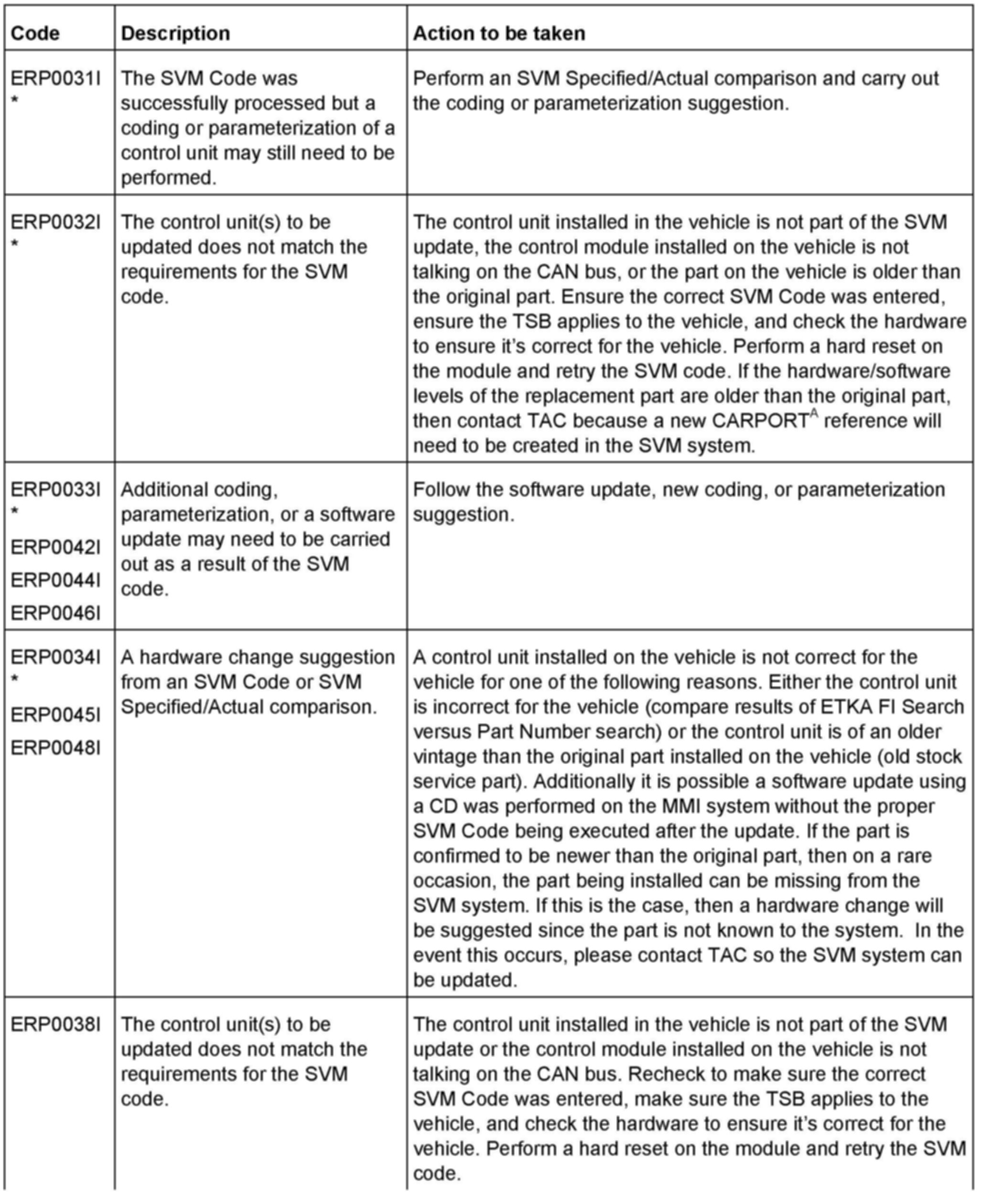 3. Update the electronic damping control module (J250) using the SVM action code as listed in the table below if necessary.
