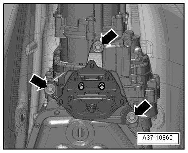 - Remove the bolts - arrows - and the transmission support with the transmission mount from the transmission.