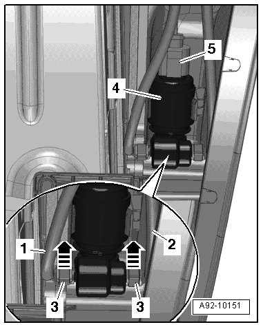 - Remove the clamp - 3 - in the direction of the - arrow - and pull the water lines - 1 - and - 2 - off the windshield washer pump.