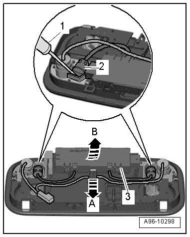 - Release retaining clips - arrow A - and tip Anti-Theft Alarm System Sensor - item 3 - out of interior light/reading lamp - arrow B -.