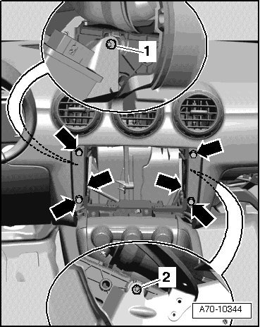 - Remove center console side screws - 1 - and - 2 -.