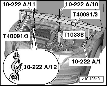 - Engage (10 - 222 A /11) with (10 - 222 A /12) on right engine lifting eye.