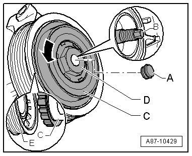 If the drive plate - C - overload protection activates, rotate the pulley - E - using the outer part of the drive plate - C - so that the compressor shaft - B - and the hexagon head on the drive plate - D - (inner part of the drive plate - C -) do not rotate.
