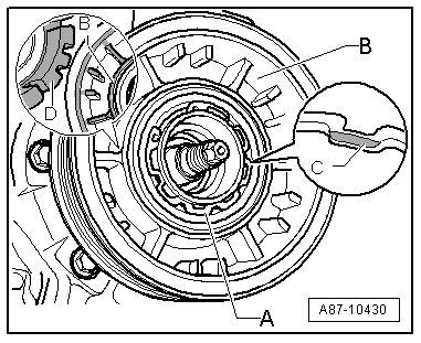 - Install the drive plate - C - onto the compressor shaft - B - by rotating it opposite the direction of arrow - arrow -.