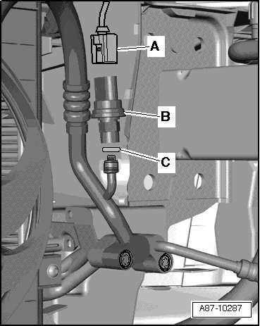 - Remove the high pressure sensor (G65) - B - from the connection on the condenser on the refrigerant line.