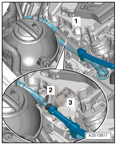 - Disengage fuel line on bracket and remove heat shield - 1 - on fuel line separating point.