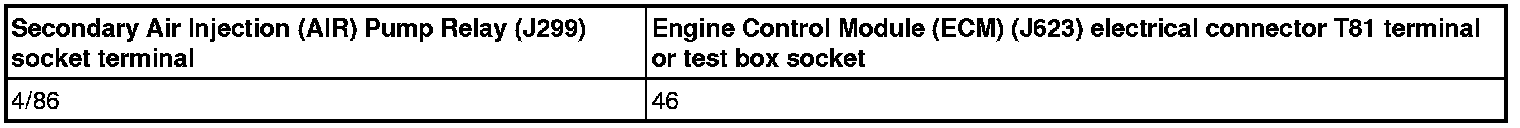 - Using a Multimeter, check the Secondary Air Injection (AIR) Pump Relay (J299) socket 3/86 to the Engine Control Module (ECM) (J623) electrical harness connector T81 terminal 46 for resistance.