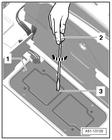 - Open hydraulic pump valve by rotating valve bolt 180° counterclockwise using a screwdriver - 2 - through the opening - 3 - in the pump housing cover - 1 -.