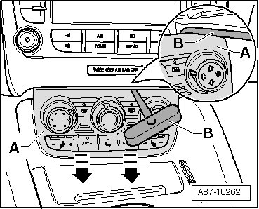 • The Climatronic control module is held by the clips and brackets in the center console. If clips are stuck, they must be loosened from behind with a screwdriver.