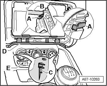 • At start of production, clips - A - are installed on the Climatronic control module (J255) that hold control head firmly in center console so that it cannot be removed without first loosening the retainer (a revised retainer will be introduced as a running change, the deadline is not yet finalized).