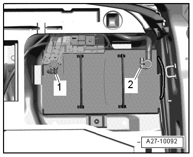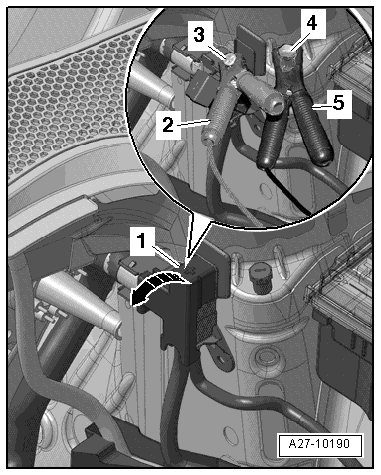 - Open the cover - 1 - over the positive terminal clamp - arrow -.