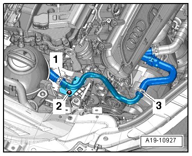 - Remove the screw - 2 - for the right coolant pipe.