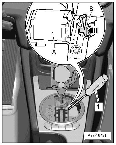 - Release selector lever lock solenoid - A - by pressing lever - B - inward - arrow - with a screwdriver - 1 - and hold in this position.