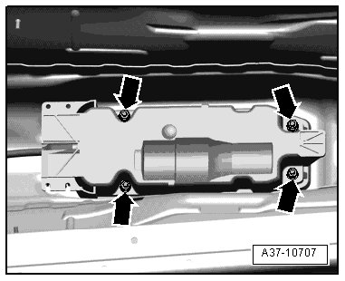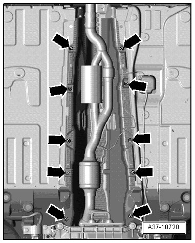 - Remove exhaust system bracket and tunnel brace - arrows -.