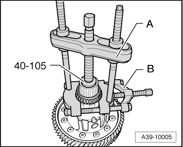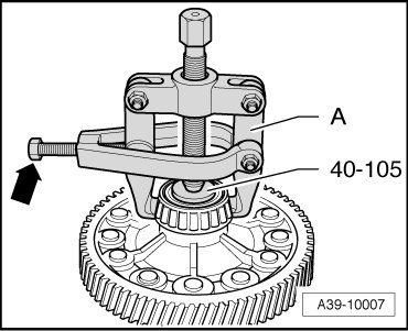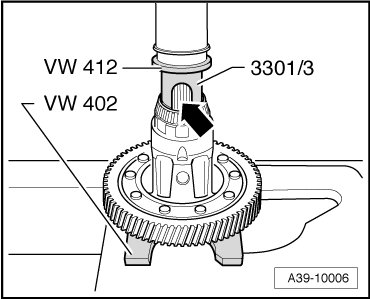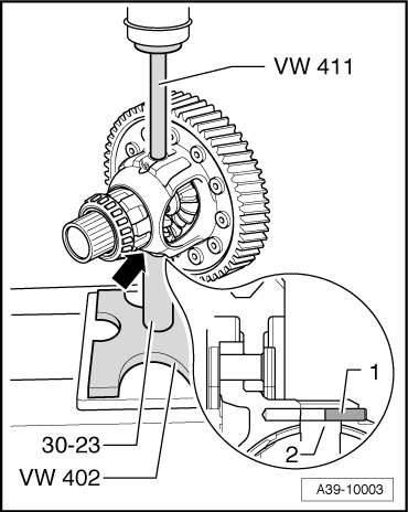 - Press in the differential bevel gear axle - arrow A - up to the first small differential bevel gear.