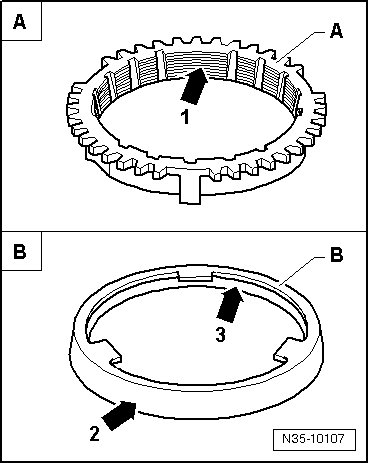 • Check the grooves - arrow 1 - of synchronizer ring - A - and inner race for flat areas (grooves are worn).