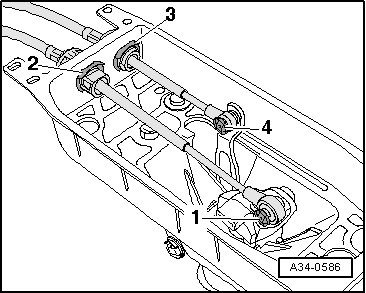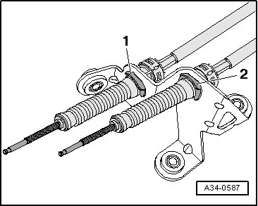- Secure the shift cable and selector cable to the selector mechanism housing with the circlips - 1 to 4 -.