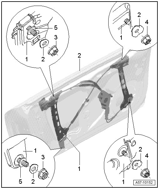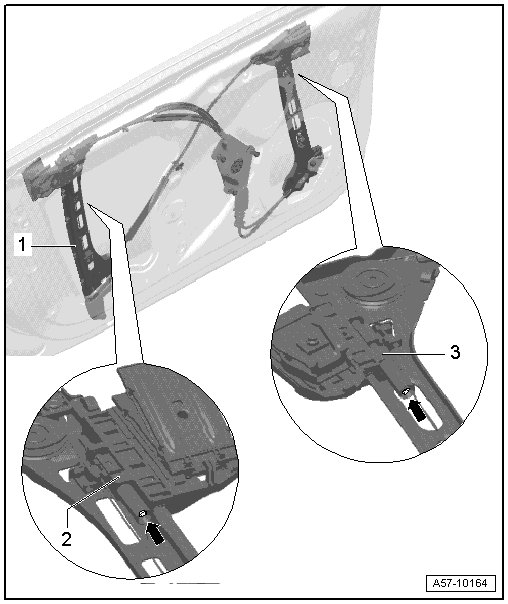- Slide window regulator motor - 1 -onto threaded pin - 3 -and secure with screws - 2 -.
