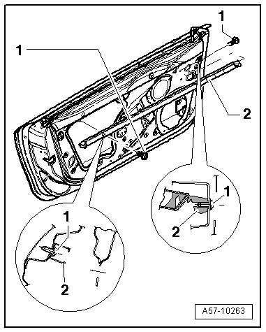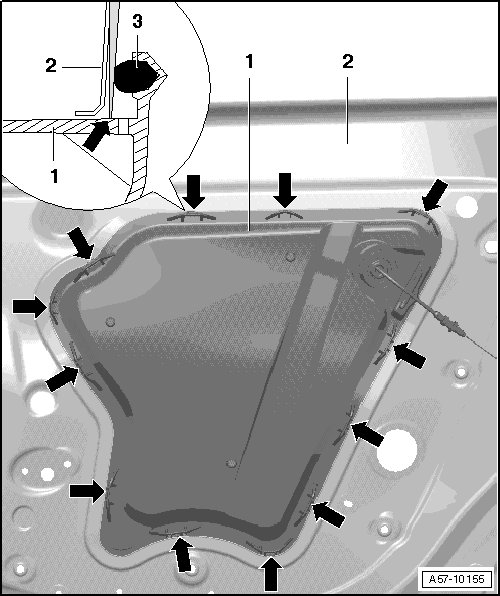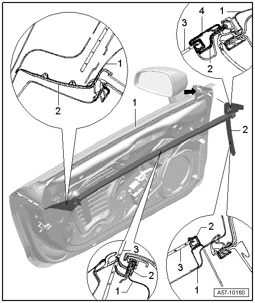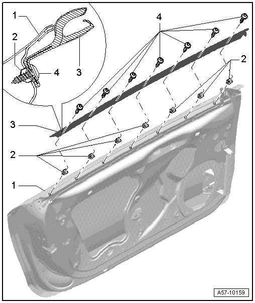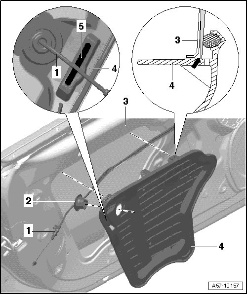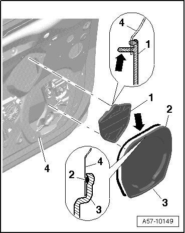 - Insert centering pin - arrow - on cover - 1 - into inner door panel - 4 - and press on.