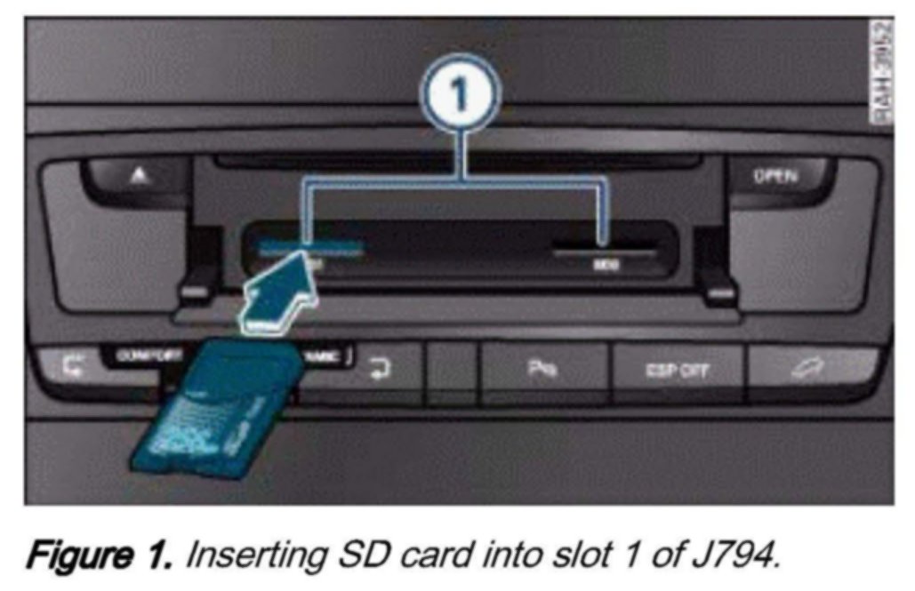 3. Insert the Navigation data SD card into SD slot 1 of the MMI main unit J794 located in the center of the instrument panel (glove box in A6 models).