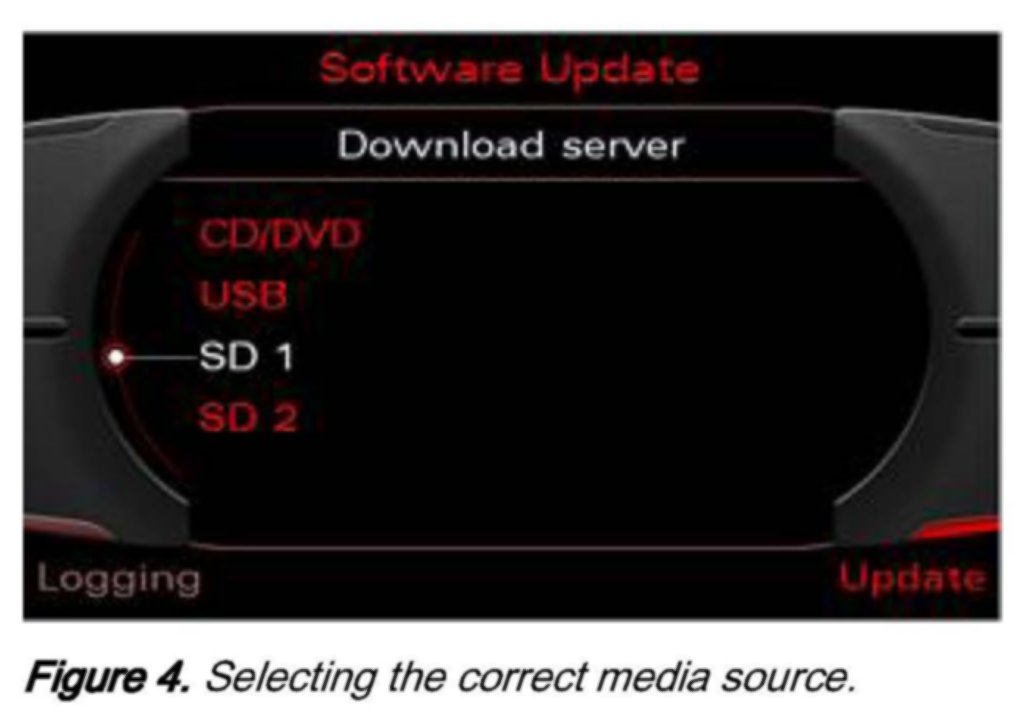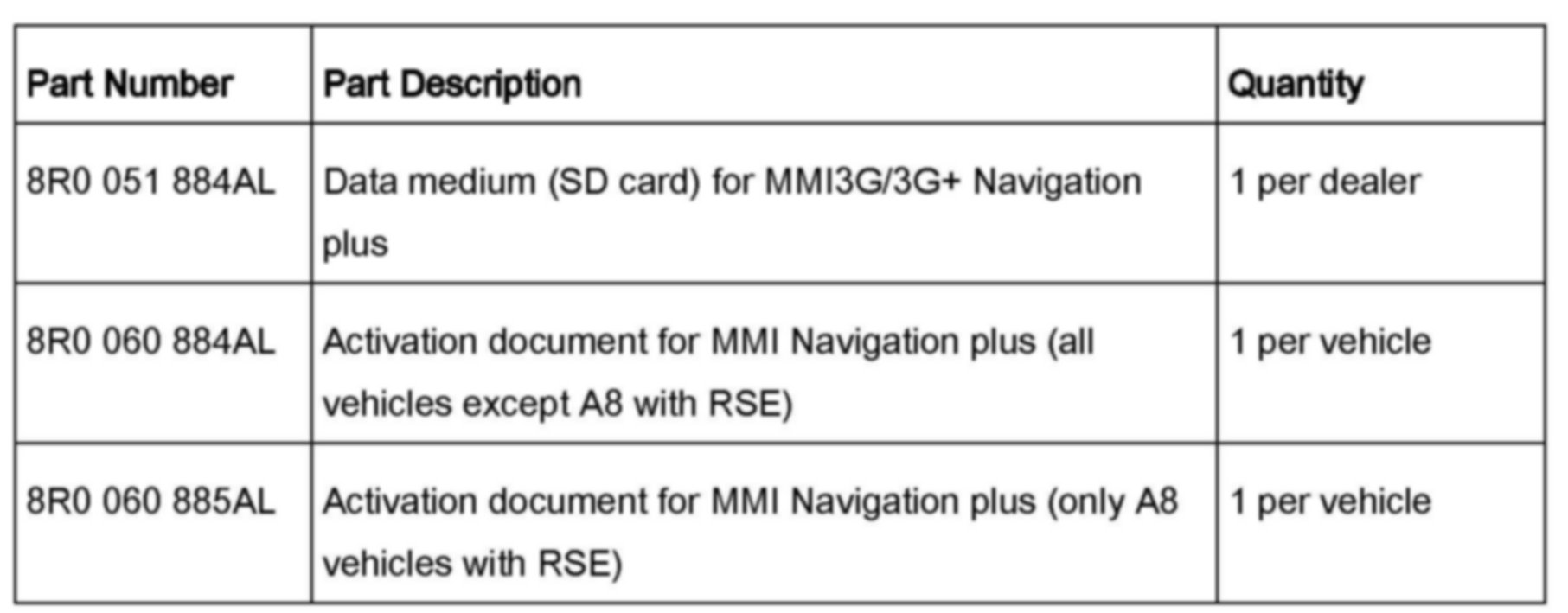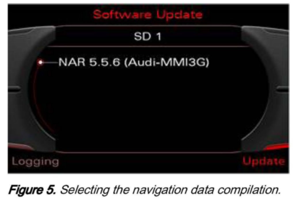 Tip: The steps below are not comprehensive and are only intended to highlight differences from a MMI software (Zug) update. Refer to TSB 2028141, 91 Generic instructions for updating MMI3G / MMI3G+ software and navigation data, for more detailed instructions on MMI update procedures. Note however that the instructions are generic and some portions may not apply to this specific TSB (e.g. importing and exporting customer code data is not necessary for this navigation data compilation update).