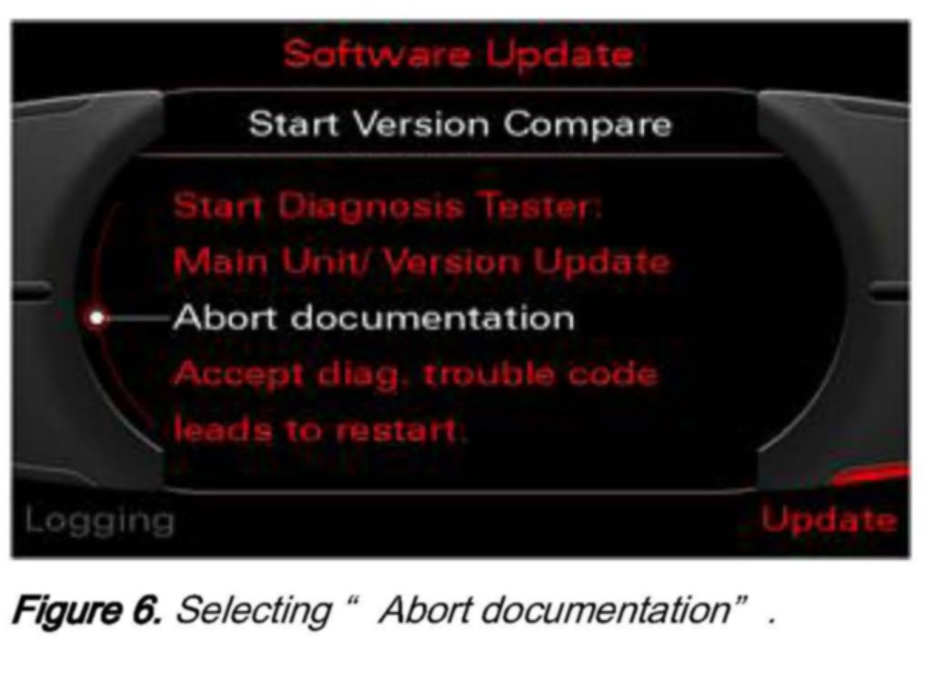 9. Once the data transfer is complete, confirm the "Abort documentation" selection. The 3G MMI system will restart.
