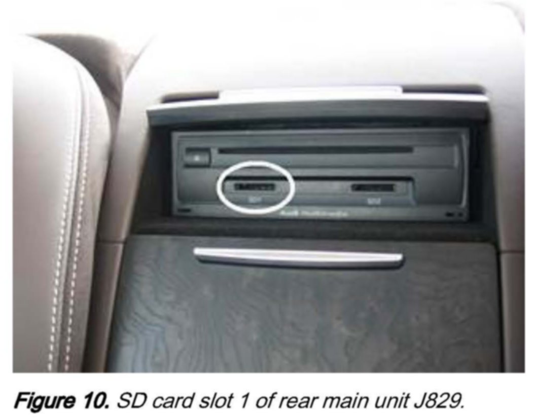 4. Remove the Navigation data SD card from the front MMI main unit J794 and insert it into SD slot 1 of the rear MMI main unit J829, located behind the cover between the rear seatbacks.