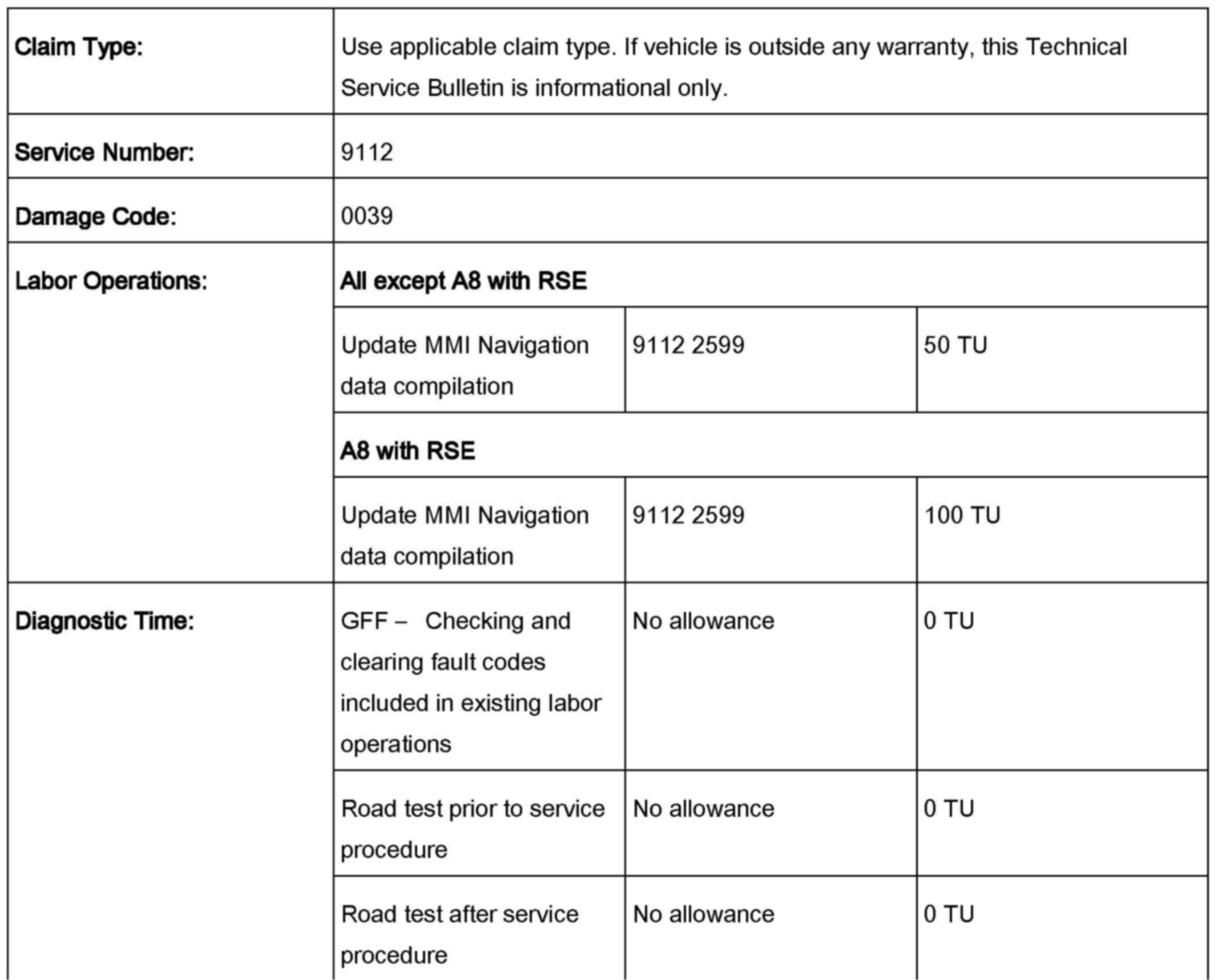 1. Update the MMI navigation data compilation. For A8 vehicles with RSE the hard drive of both the front and rear Main unit (address word 5F and 7F) will need to be updated.