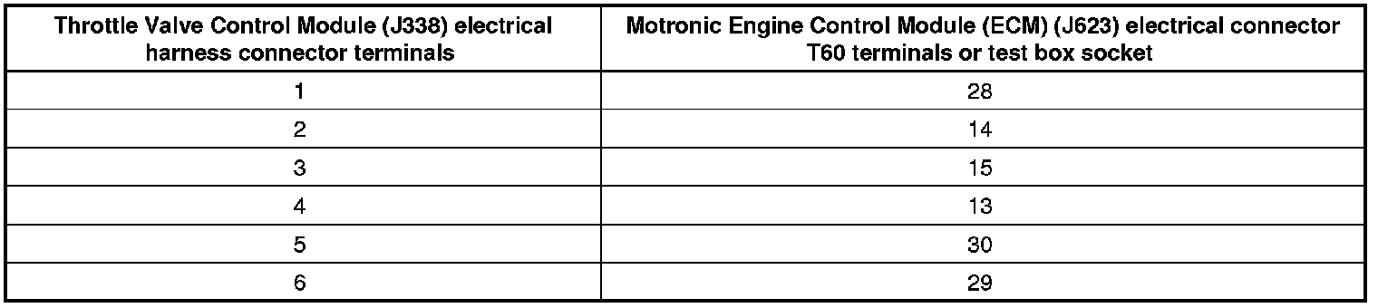 - Using a multimeter, check the Throttle Valve Control Module (J338) electrical harness connector terminals to the Motronic Engine Control Module (ECM) (J623) electrical harness connector T60 terminals for an open circuit according to the wiring diagram.