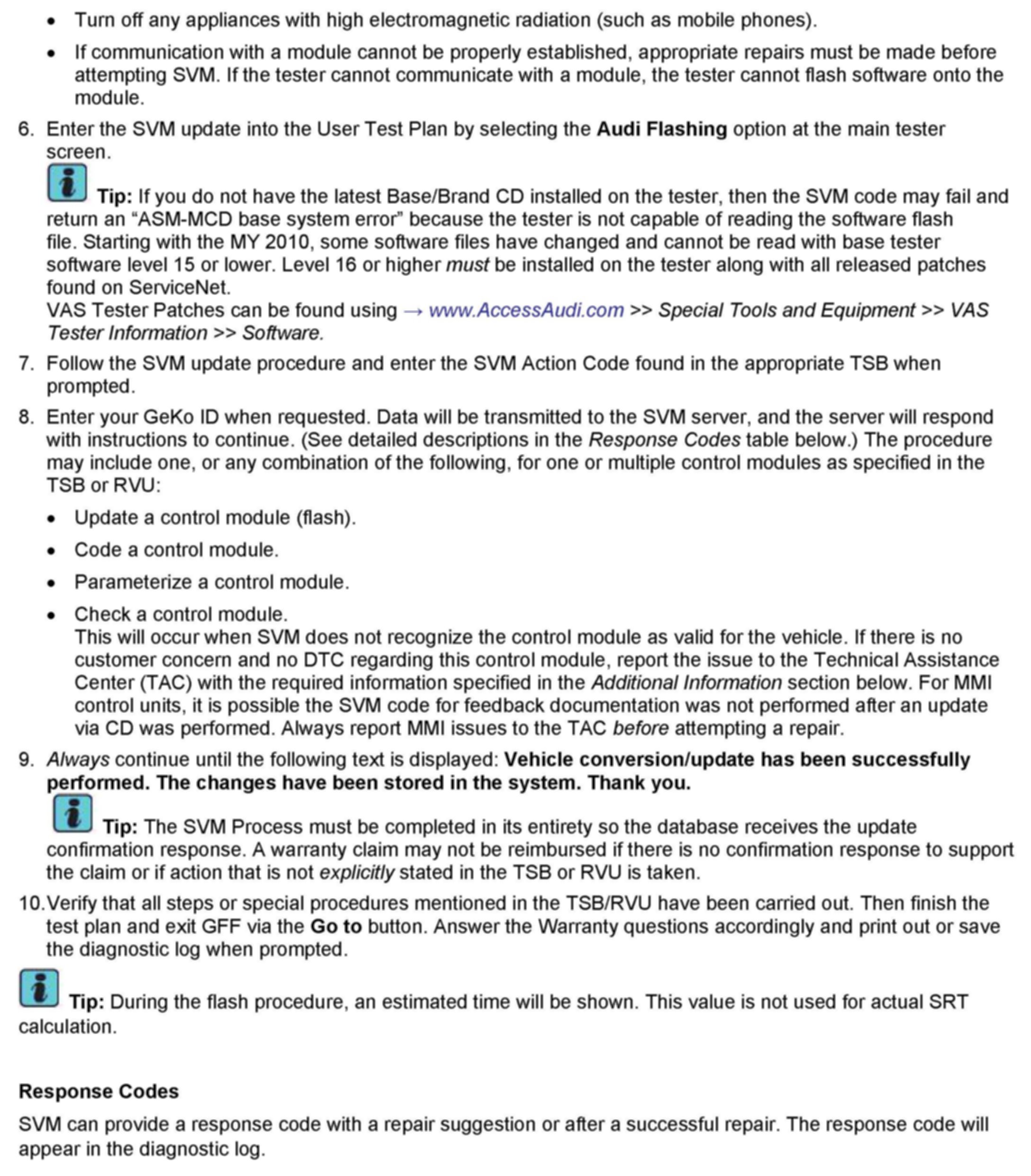 1. Follow all instructions in the attached TSB 2011732 00 Software Version Management (SVM), operating instructions. For the feedback documentation use the SVM code printed on the update CD.