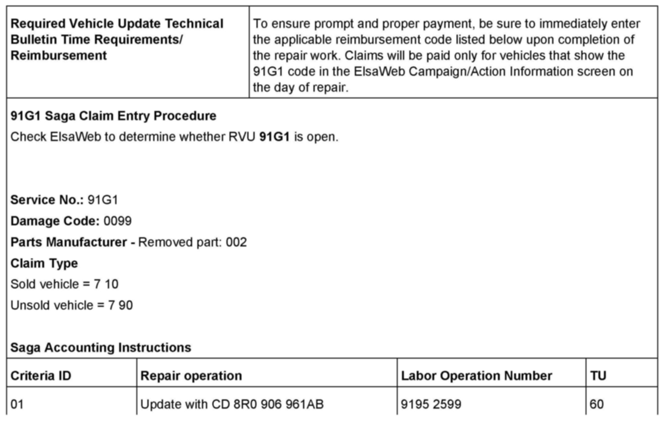 ^ Procedure is valid only for vehicles that show the 91G1 code in the ElsaWeb Campaign/Action Information screen on the day of repair.