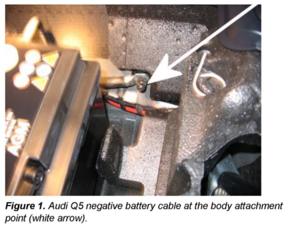 2. Connect the negative cable clamp to the vehicles negative battery cable downstream at the body attachment point. (Figures 1 and 2 illustrate this on an Audi Q5.)
