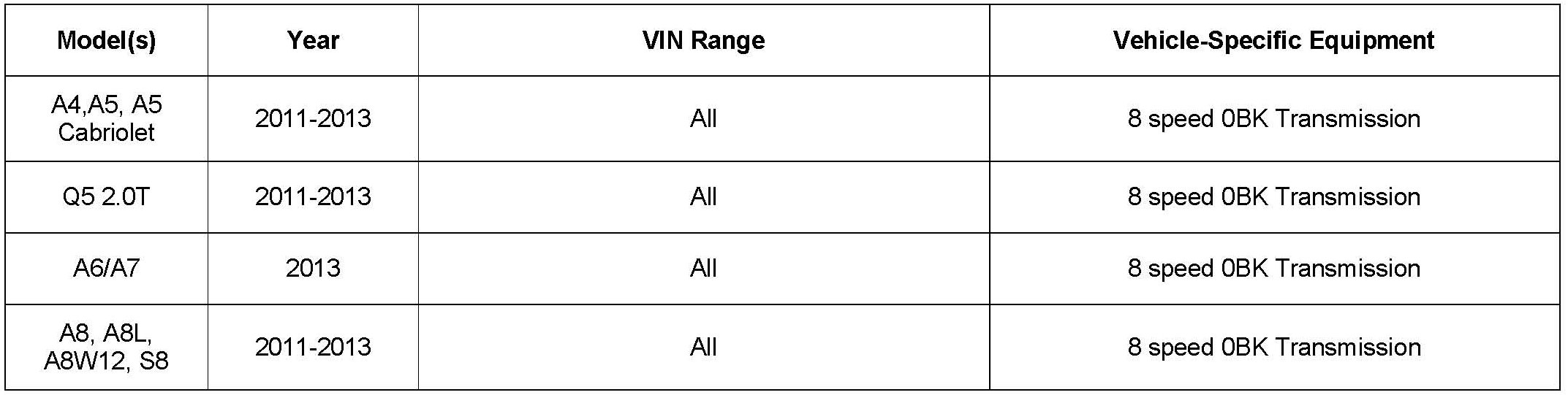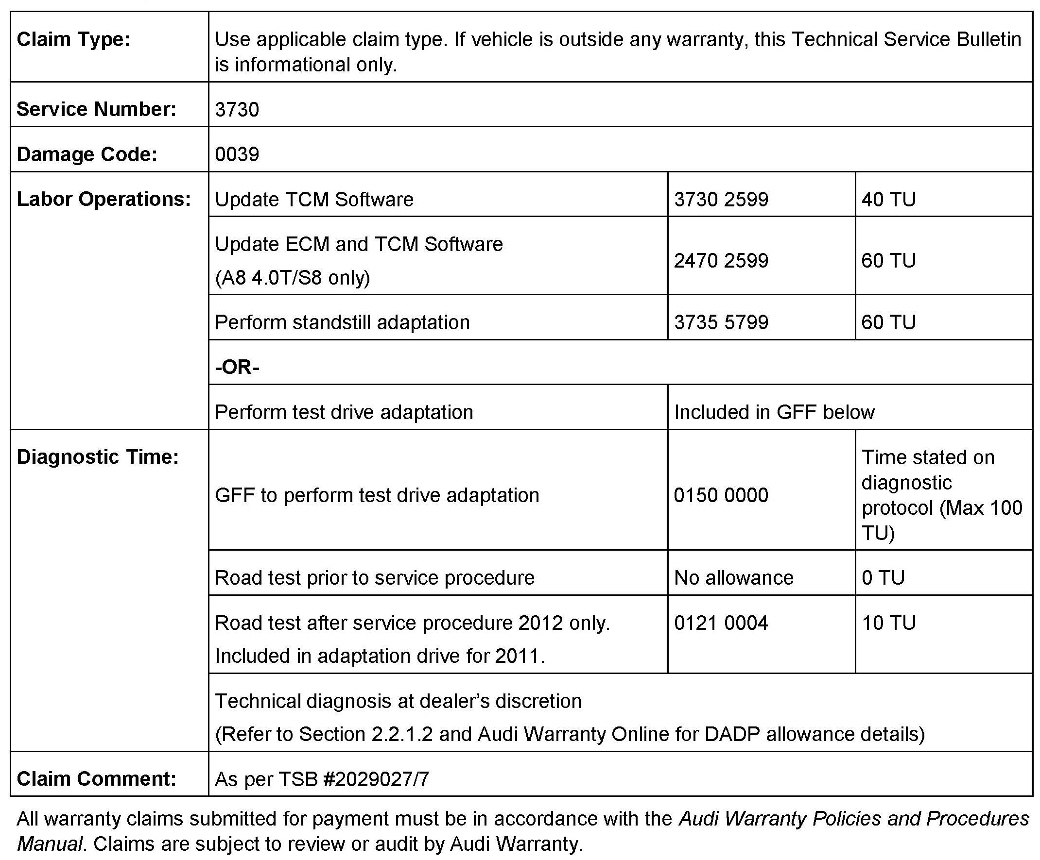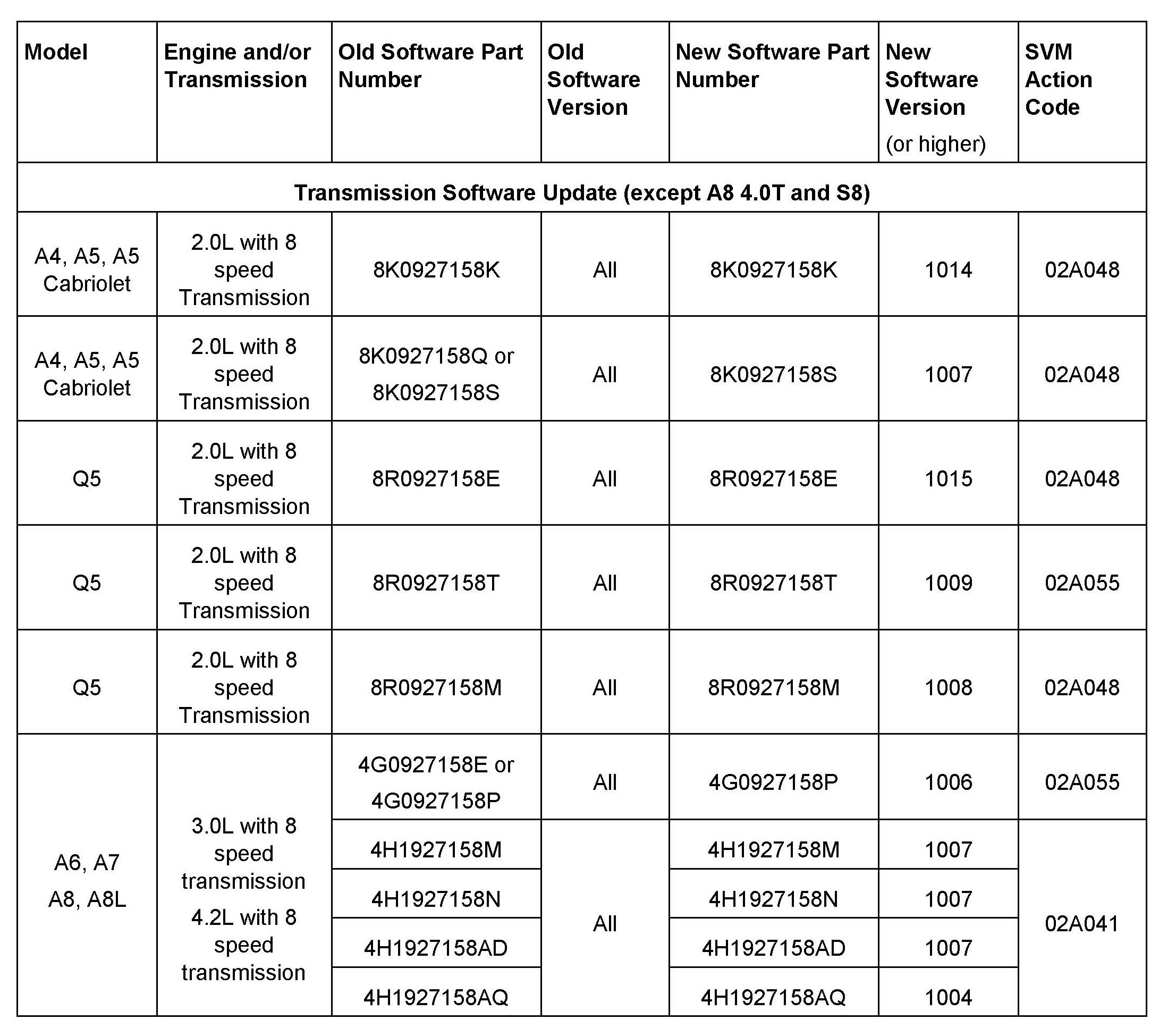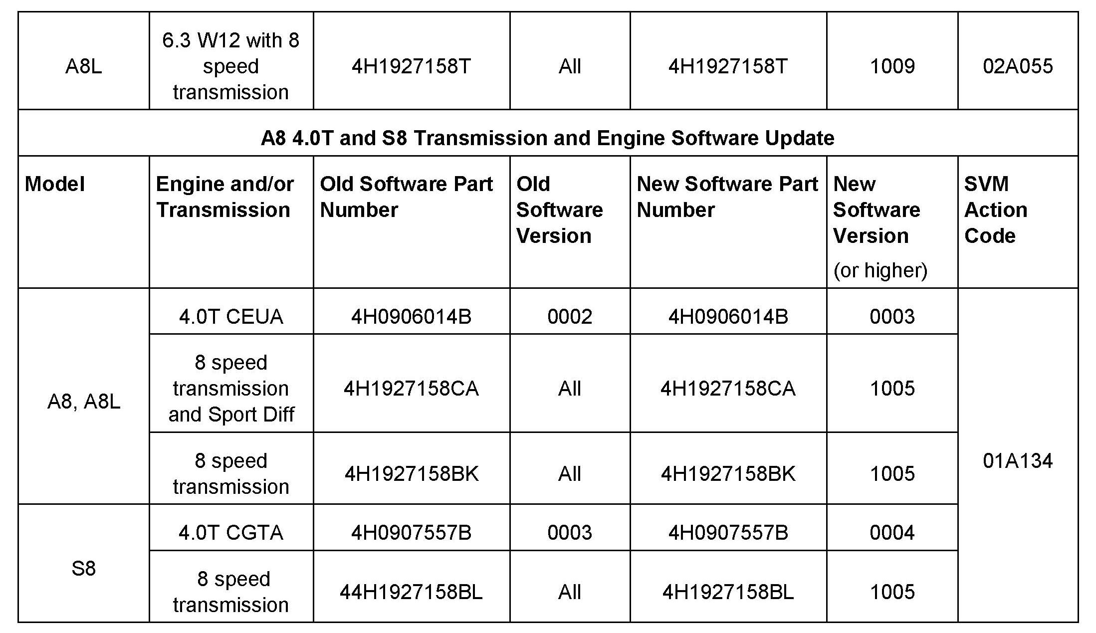 ^ For the A8 4.0T and S8 models, there is new software in Engine Control Module (ECM), J623 (01) that should be used in combination with new software in the Transmission Control Module, J217 (02), which addresses the condition.