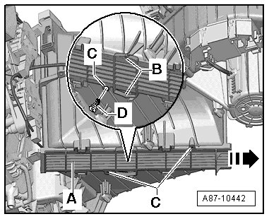 - Install the dust and pollen filter - A - on the correct side ( the angle - C - on the side facing the fresh air blower - D -)