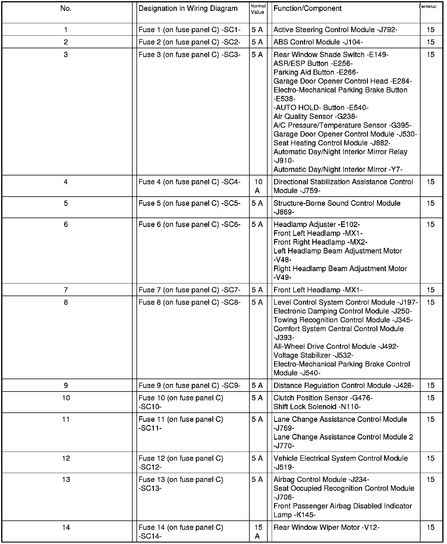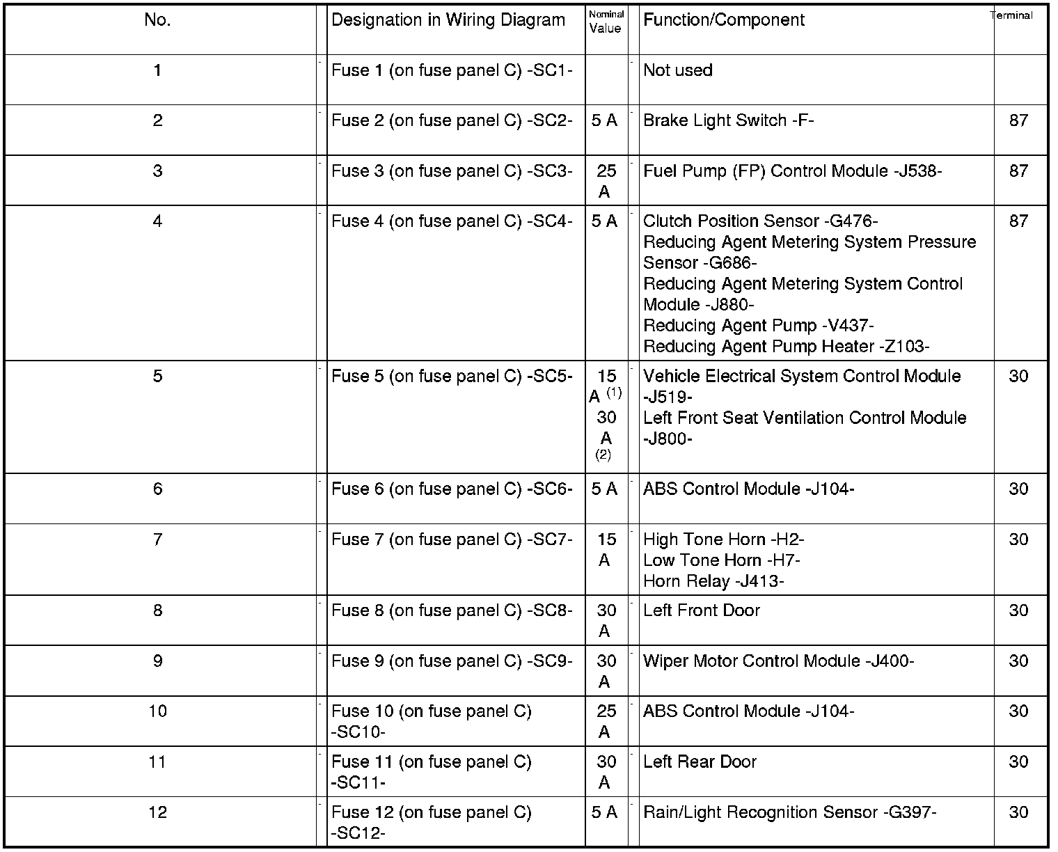 Fuse Panel C -SC- From August 2011