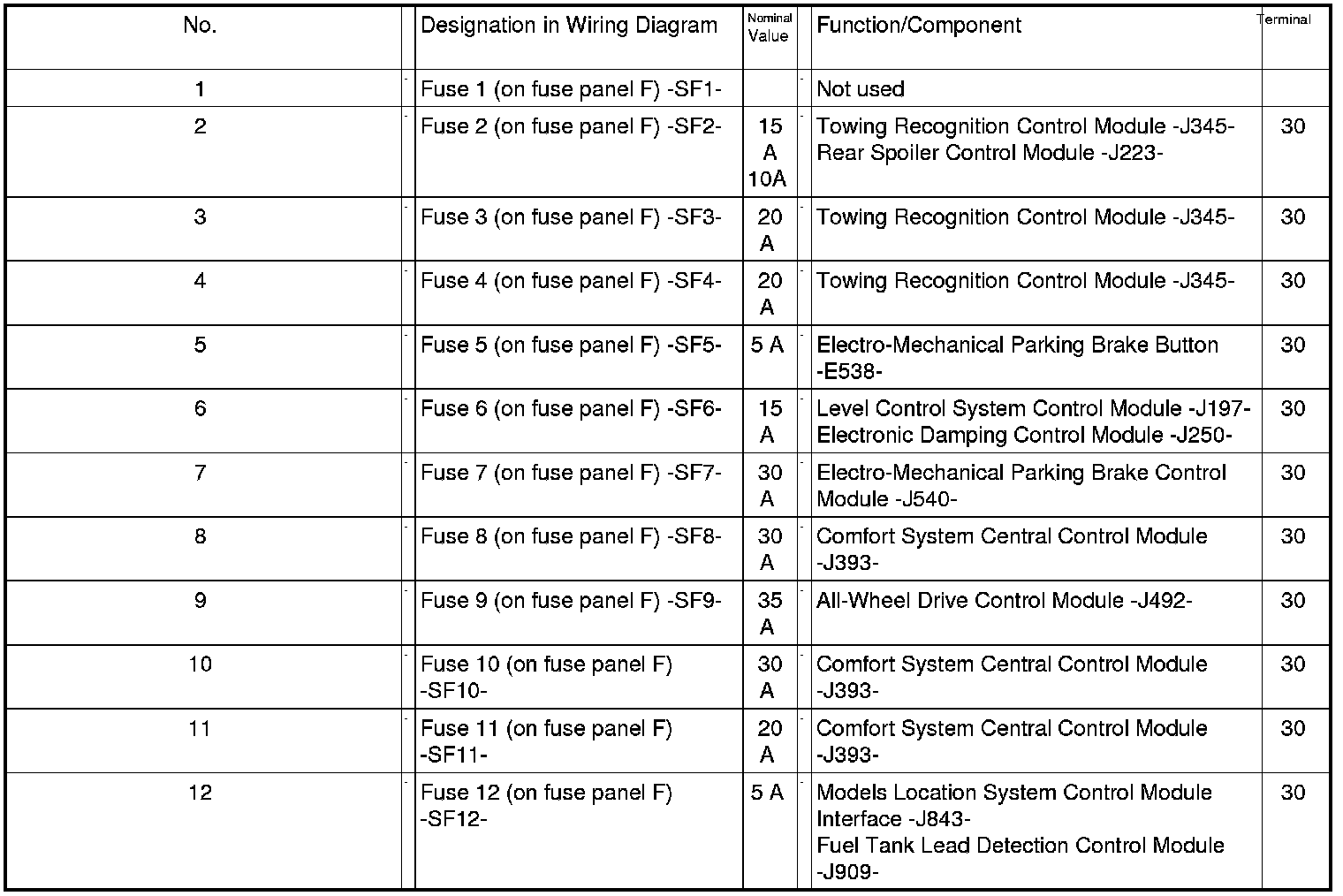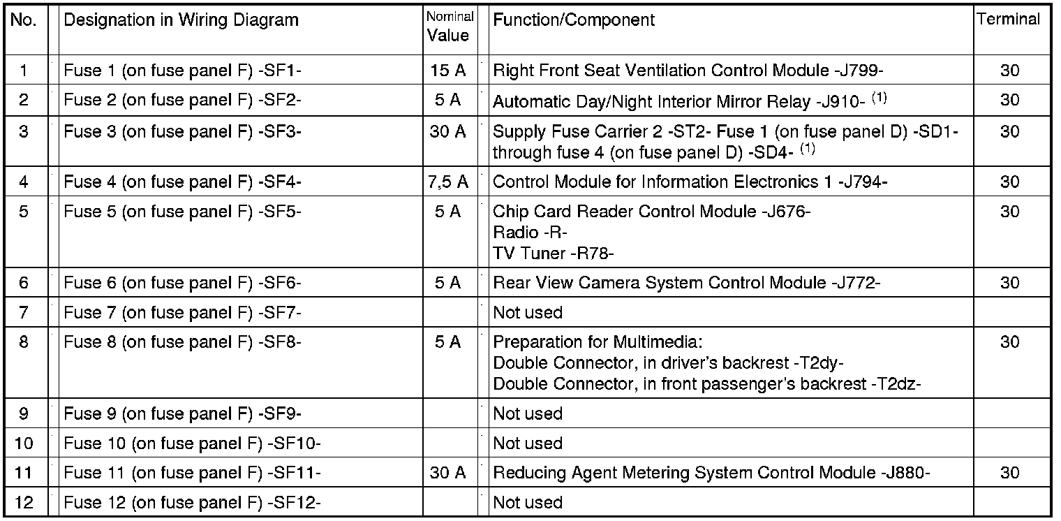 Relay /Fuse Panel F -SF- from August 2011
