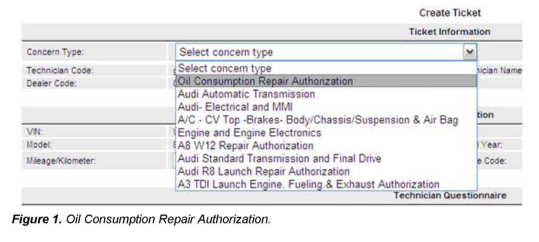 2. When creating a TAC ticket, in the field Concern Type, select Oil Consumption Repair Authorization, as shown above.
