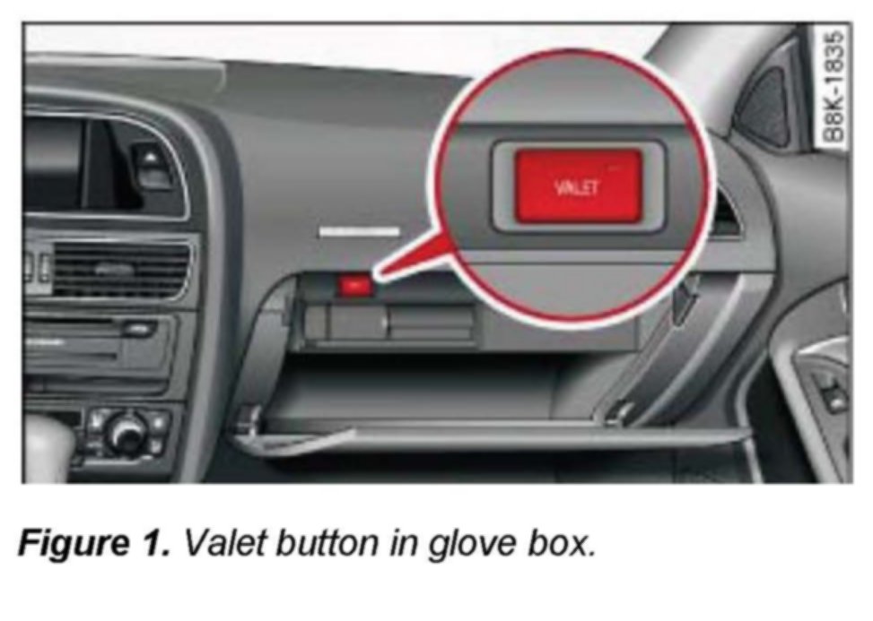 Vehicles have a VALET button in the glove box to activate the "valet parking" feature, preventing unauthorized access to the trunk. When activated the trunk can only be opened using the mechanical key.