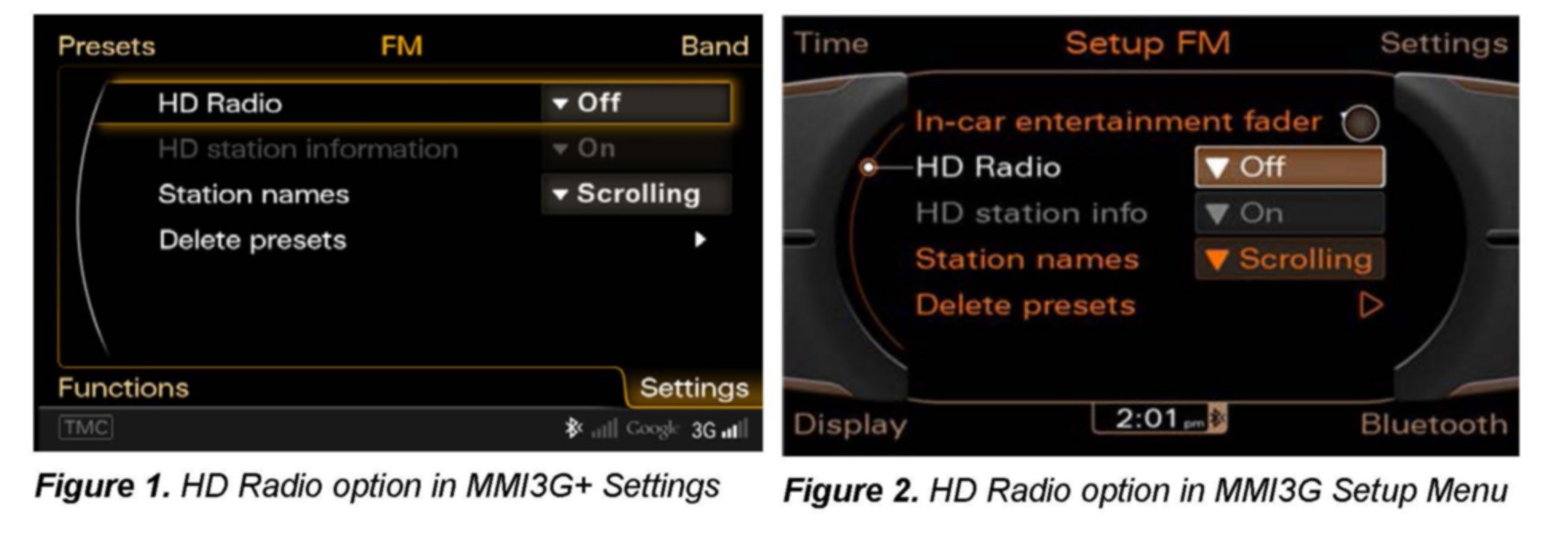 The customer complains that HD Radio feature is automatically turning back on even after they have turned off this feature using the Radio settings or Setup menu in the MMI (Figure 1 & Figure 2).