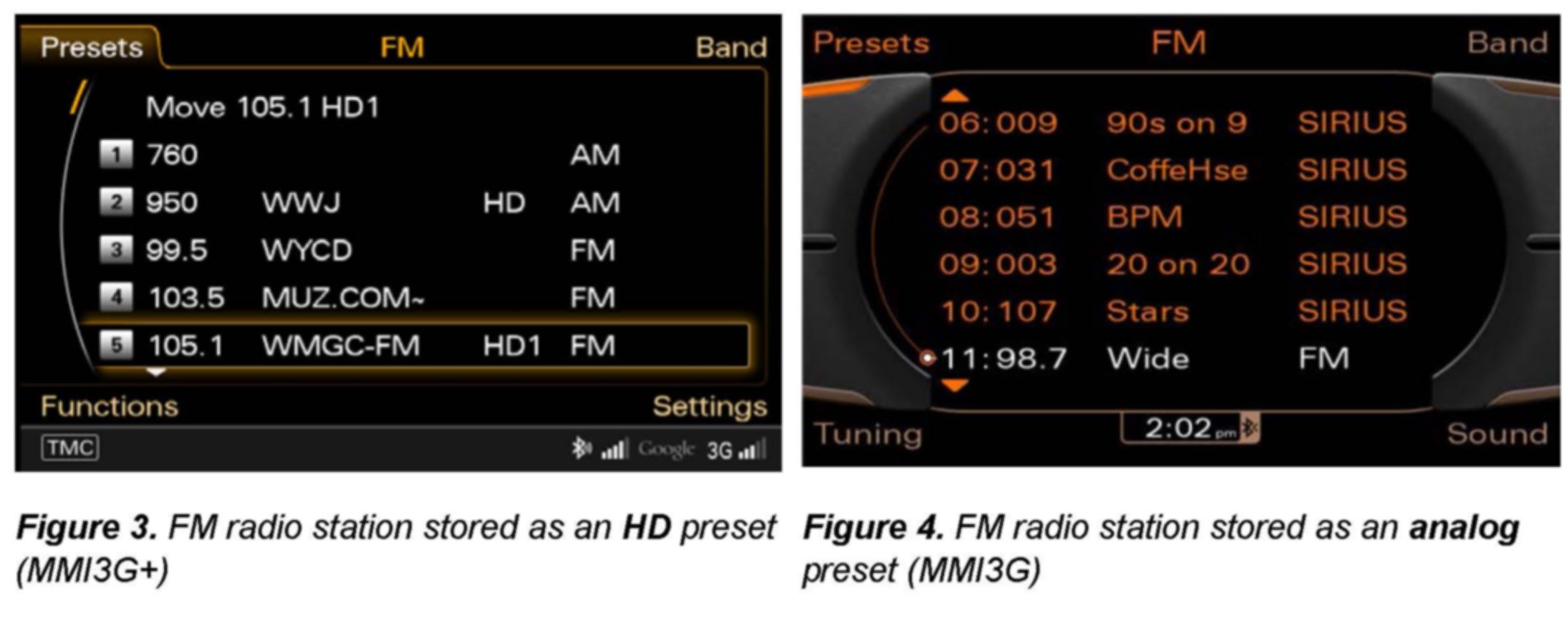 If a radio station is stored while the user is listening to the HD broadcast, the preset will be stored as an HD radio preset (Figure 3). As a result, even if the HD Radio setting is turned off in the MMI, it will be automatically turned back on whenever an HD Radio preset is selected. The user must store all FM & AM radio presets as analog stations (Figure 4).