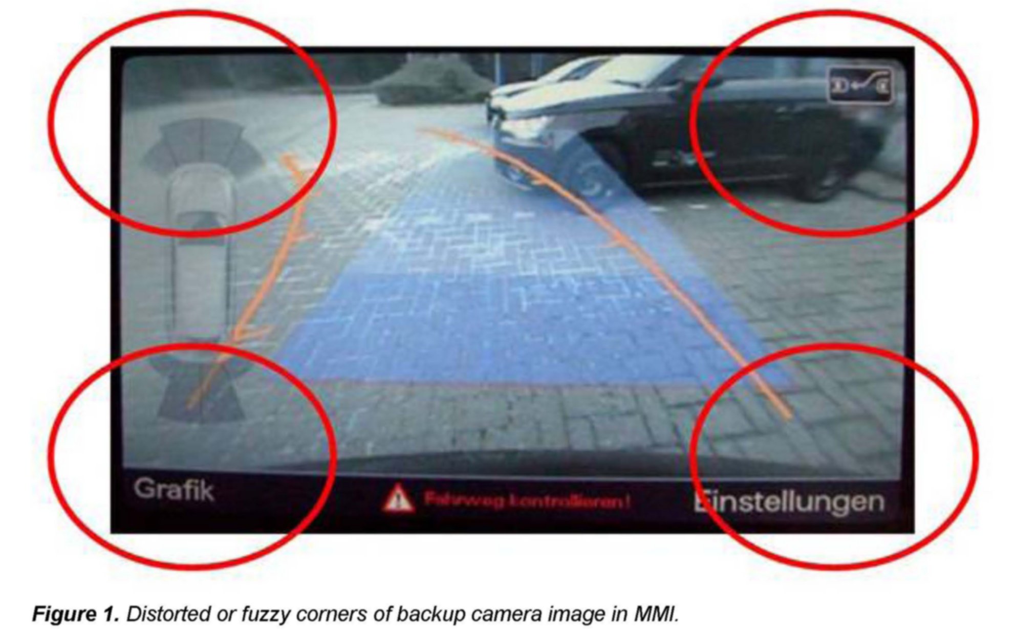 Explanation: The wide angle backup camera lens (about 140°) provides a round or curved image (fish-eye). The software inside the MMI must straighten out this "curved" image to fit the rectangular area of the MMI screen. As a result, the picture from the camera shown in the MMI screen is less sharp or focused in the corners of the image than compared to the center of the image. This is more noticeable in vehicles with a larger MMI screen because the image is expanded or "blown up".