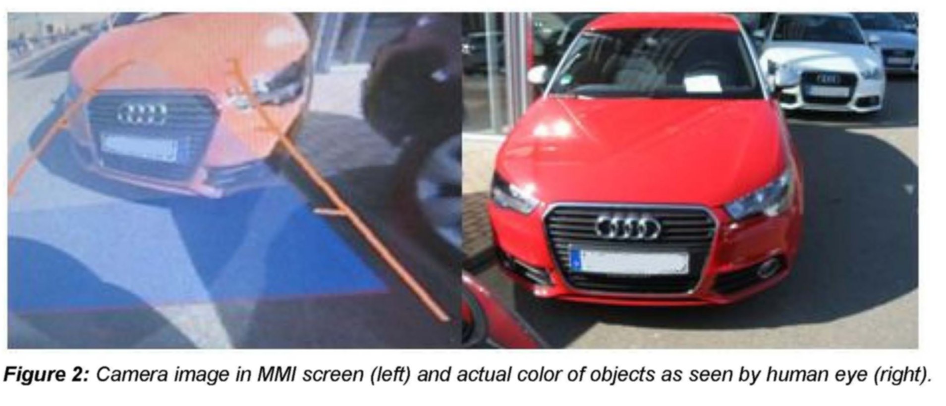 Explanation: The backup camera adjusts the image in the MMI screen dynamically in response to the ambient light and tries to find the optimal representation of brightness, contrast, and color (comparable to the exposure control of a camera). As a result the overall brightness, contrast, and colors of the backup camera image in the MMI may appear to be different than the actual color seen by the human eye.
