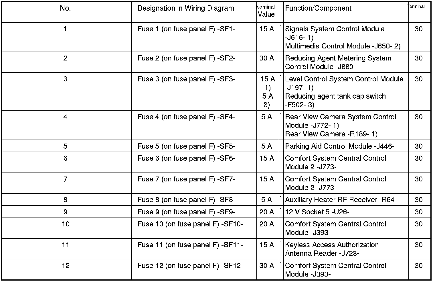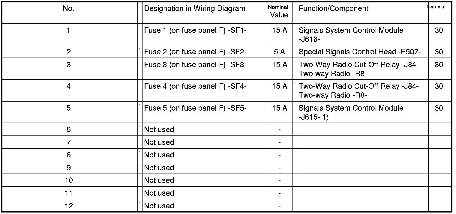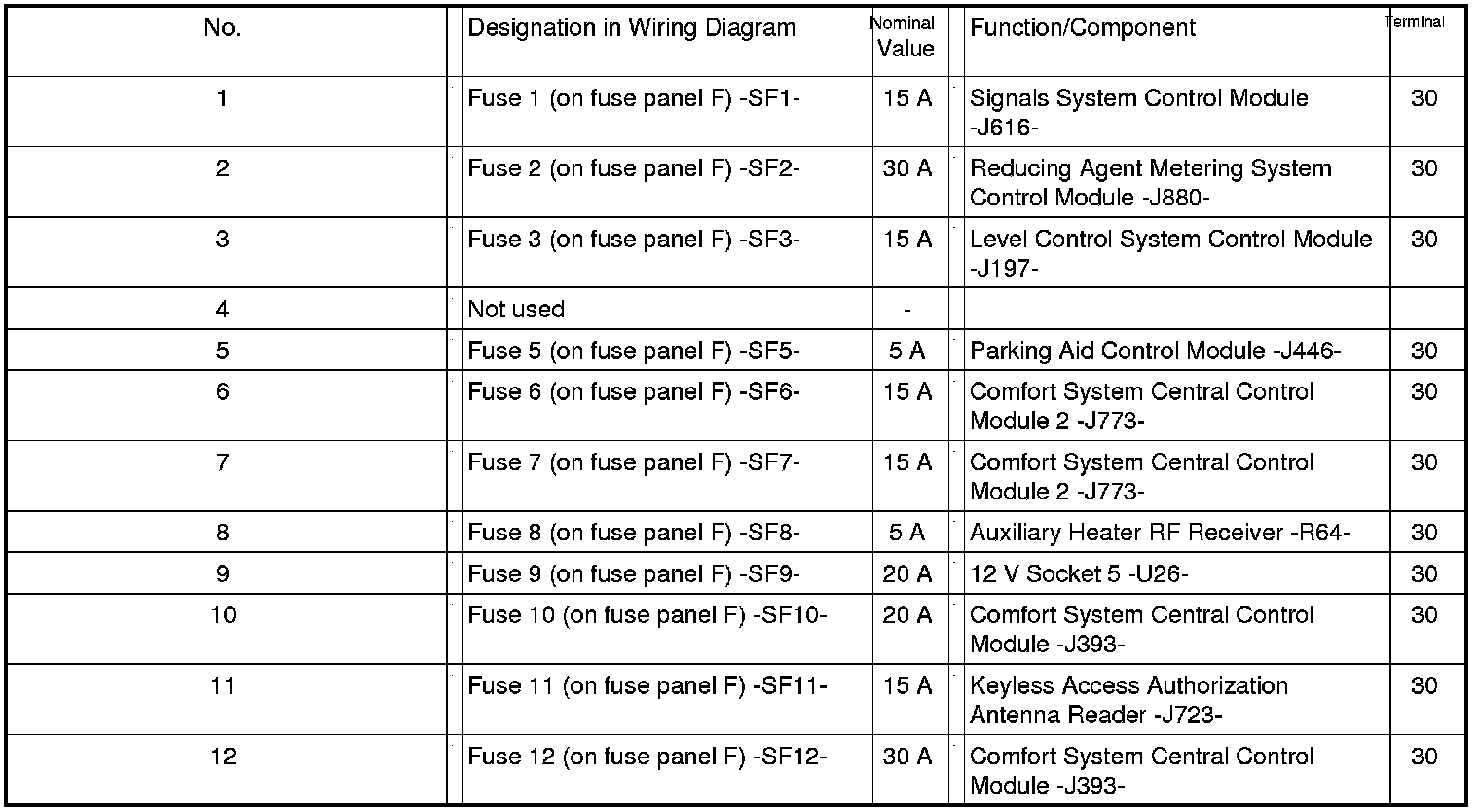 Fuses (SF) on Fuse Panel F