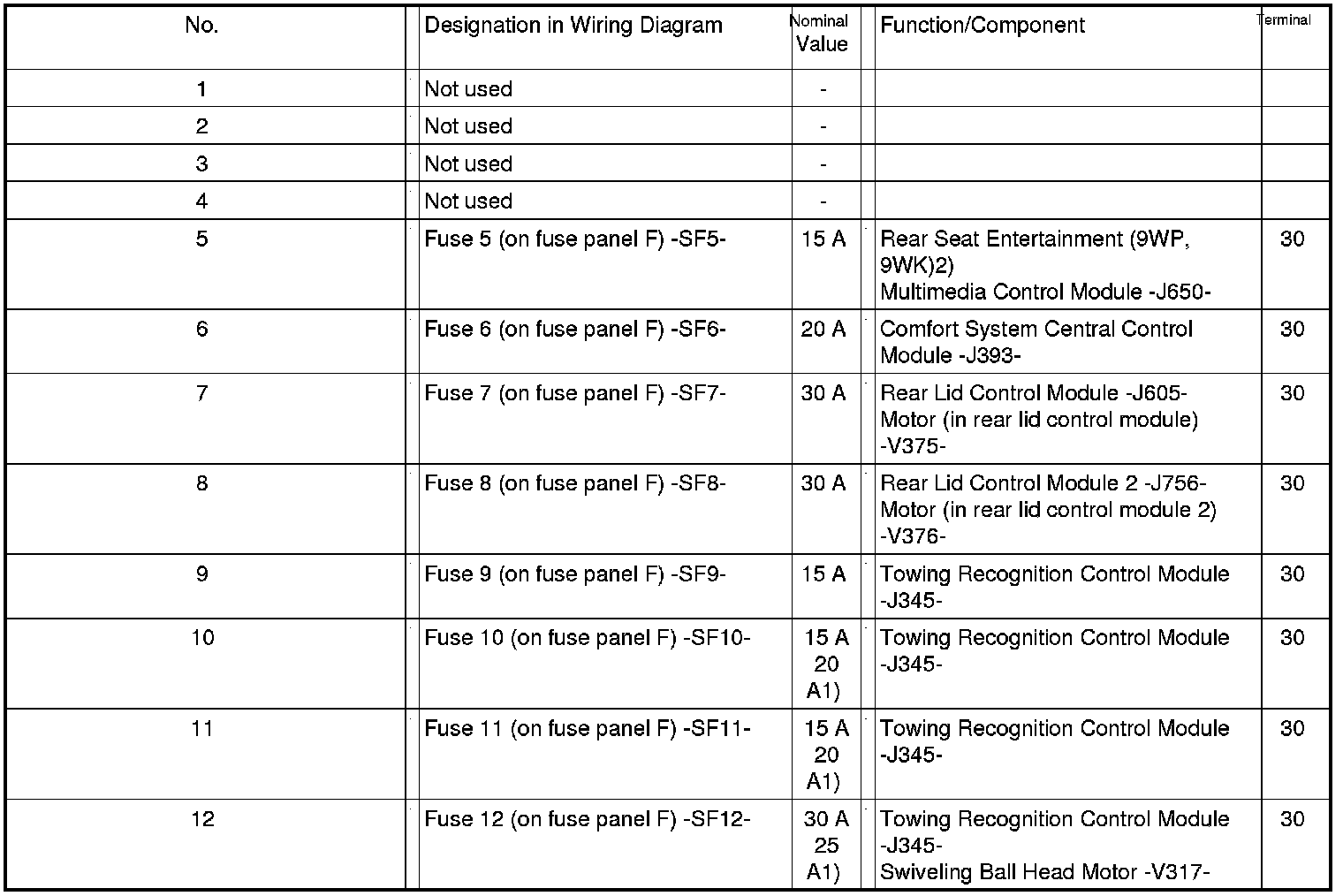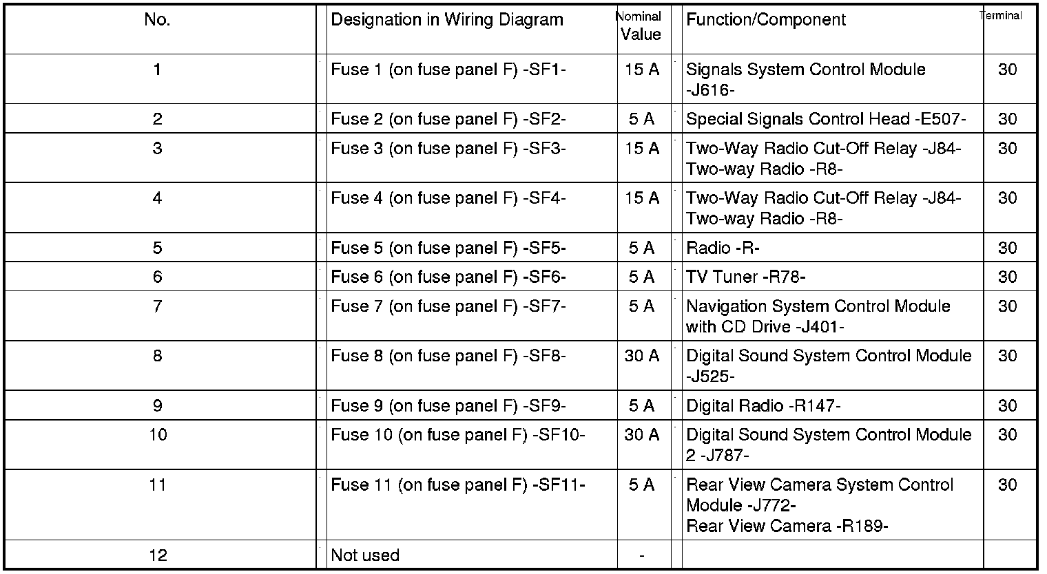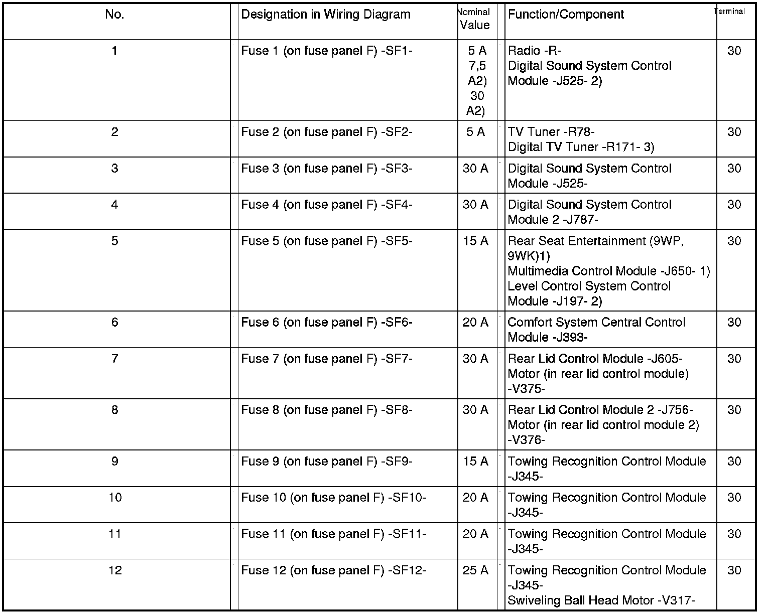 Fuses (SF) on Fuse Panel F